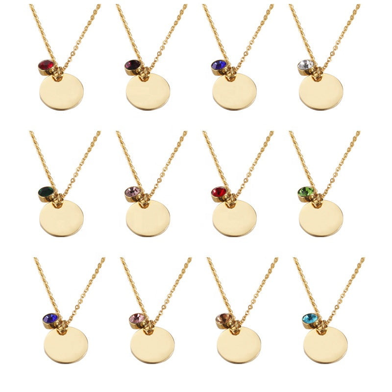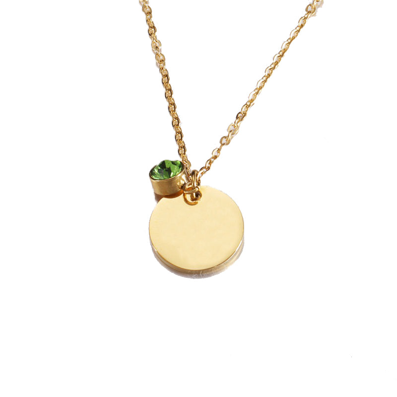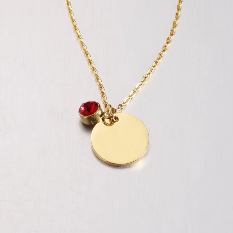 Elegante Halskette mit rundem Plättchen-Anhänger aus hochwertigem Edelstahl – vergoldet und kombiniert mit funkelndem Geburtsstein. Perfekt zum Gravieren und als persönliches Geschenk für deine Liebsten oder für dich selbst.
